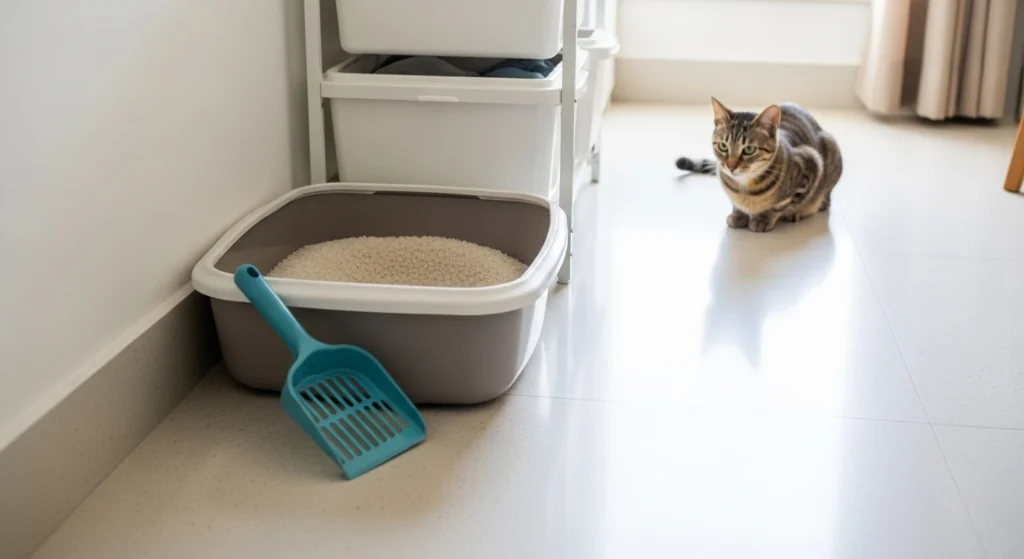 A imagem mostra uma caixa sanitária para gato preenchida com cristais de sílica em um ambiente doméstico limpo e organizado. Os cristais aparecem secos e bem distribuídos, sugerindo uma manutenção simples e rápida. Ao lado da caixa há uma pá de limpeza, enquanto um gato observa o espaço com tranquilidade. A cena transmite a ideia de rotina prática e controle de higiene em um apartamento brasileiro.
