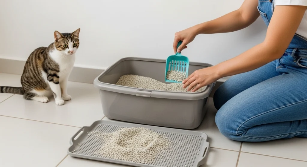 A imagem mostra um tutor realizando a manutenção da caixa sanitária do gato em um ambiente doméstico organizado. Com uma pá, ele retira resíduos e redistribui o granulado para manter a caixa funcional por mais tempo. O gato observa o processo com tranquilidade, enquanto um tapete coletor ajuda a reduzir sujeira espalhada pelo piso. A cena transmite a ideia de rotina de prevenção e cuidado contínuo para que a higiene do animal permaneça eficiente no dia a dia.