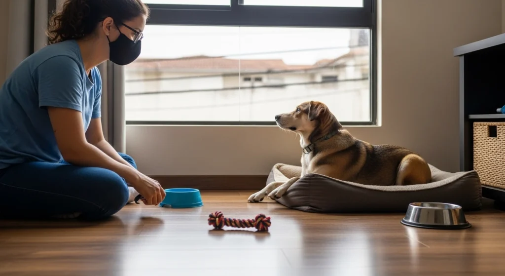 A imagem mostra um cachorro tranquilo deitado em sua caminha enquanto observa a movimentação externa pela janela. Próximo a ele, o tutor acompanha a situação de forma calma, reforçando um ambiente organizado e previsível. Brinquedos e itens do dia a dia indicam uma rotina equilibrada, destacando a ideia de prevenção e manutenção do comportamento para evitar que o ciclo de latidos excessivos volte a acontecer.
