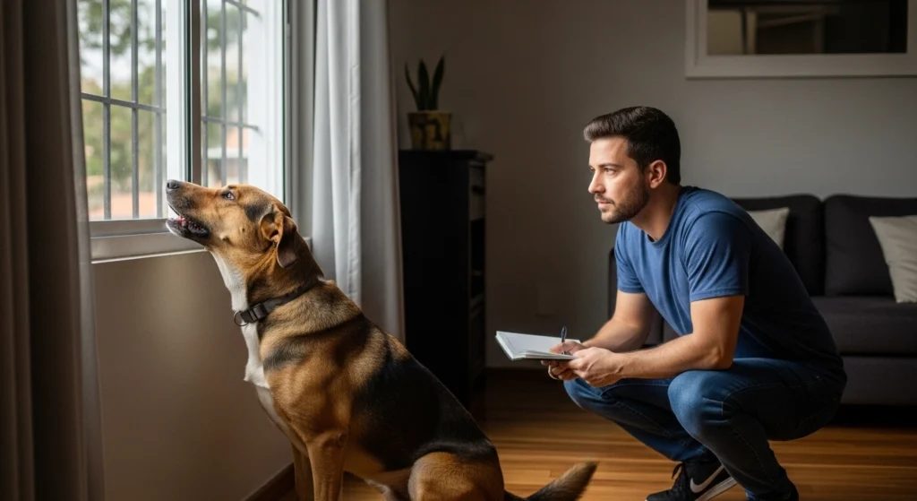 A imagem mostra um cachorro latindo perto de uma janela enquanto observa algo do lado de fora da casa. Um tutor está um pouco atrás, observando com atenção o comportamento do animal e anotando em um caderno. A cena transmite a ideia de análise e compreensão do comportamento antes de qualquer tentativa de correção, destacando a importância de identificar o motivo do latido no ambiente cotidiano do cão.