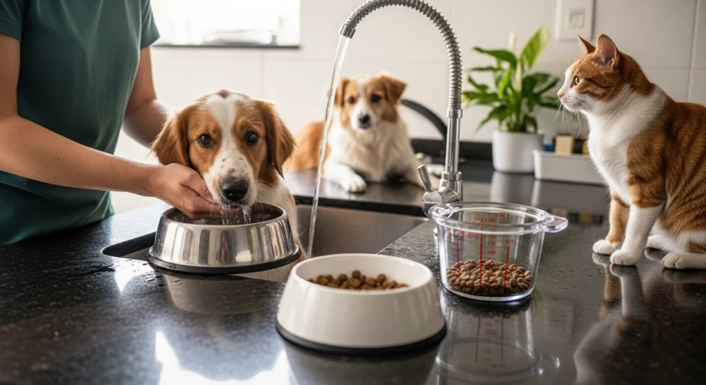 Comece definindo onde ficam os potes, quem repõe a água, quem serve as refeições e qual utensílio será usado para medir a porção. Parece básico, mas esse alinhamento evita dois problemas clássicos: alimento duplicado e falta de reposição da água.