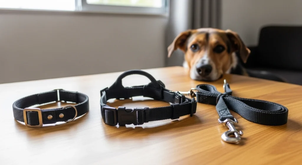 A imagem mostra um cachorro de porte médio próximo a uma mesa onde estão dispostos três itens usados no passeio: uma coleira, um peitoral e uma guia. Cada peça aparece claramente visível, permitindo observar materiais, fechos e pontos de ajuste. A iluminação natural destaca os detalhes dos equipamentos, ajudando o leitor a visualizar as diferenças entre os acessórios usados para conduzir o animal durante a caminhada.