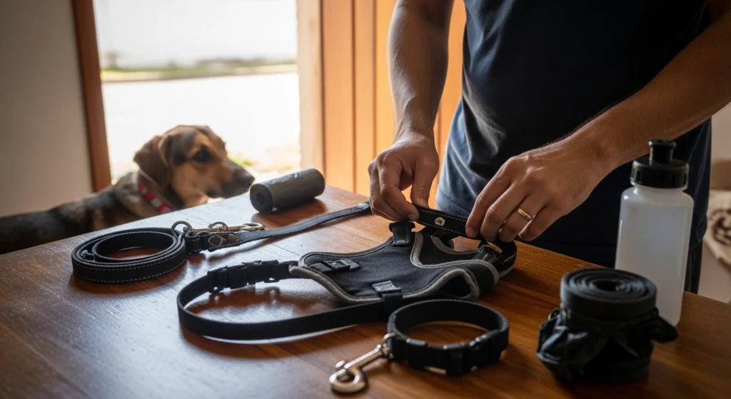 A imagem mostra um momento de preparação antes do passeio. Sobre uma mesa próxima à porta, estão organizados os itens usados na caminhada do cachorro, como guia, peitoral e saquinhos. O tutor examina o fecho e as costuras da guia, indicando uma verificação de segurança antes de sair. Ao lado, o cachorro observa atento, reforçando a ideia de rotina e cuidado na manutenção dos acessórios que garantem passeios mais seguros.