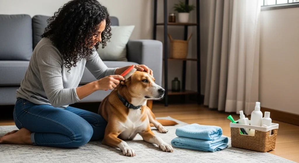 A imagem retrata um momento calmo de cuidado entre tutor e cachorro dentro de casa. O animal está relaxado enquanto recebe escovação e atenção, mostrando uma rotina de manutenção que ajuda a manter a higiene e a familiaridade com o toque. A cena transmite a ideia de prevenção: pequenos cuidados frequentes que evitam que o momento do banho volte a se tornar uma situação estressante.