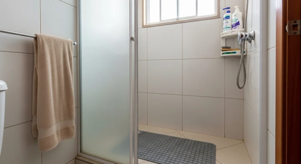 A imagem mostra um banheiro doméstico organizado antes do início da higiene do cachorro. No box há um tapete antiderrapante colocado para evitar escorregões, enquanto uma toalha limpa e os itens necessários estão separados ao alcance das mãos. A cena transmite a ideia de preparação e calma, mostrando que o ambiente já está pronto antes de chamar o animal, o que ajuda a tornar o processo mais tranquilo e previsível.