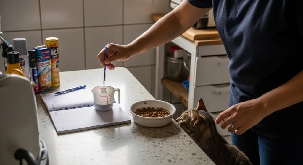 A imagem mostra um tutor avaliando a quantidade de ração colocada no pote do gato, utilizando um copo medidor e anotando os valores em um caderno. O animal observa o prato no chão, enquanto a cena destaca um ambiente doméstico tranquilo e bem iluminado. A composição transmite a ideia de monitoramento cuidadoso da alimentação, ilustrando de forma prática como acompanhar a ingestão diária do pet em casa.