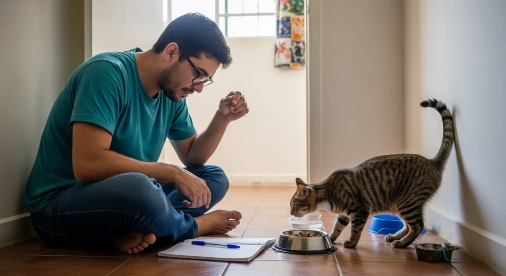 A imagem retrata um tutor observando o comportamento alimentar do gato próximo ao pote de ração. Ao lado, um caderno e uma caneta sugerem que a pessoa está anotando informações sobre a alimentação do animal. A cena transmite a ideia de avaliação cuidadosa do dia a dia, mostrando um momento de atenção ao comportamento do pet para decidir se a situação exige apenas monitoramento ou uma ação mais rápida.