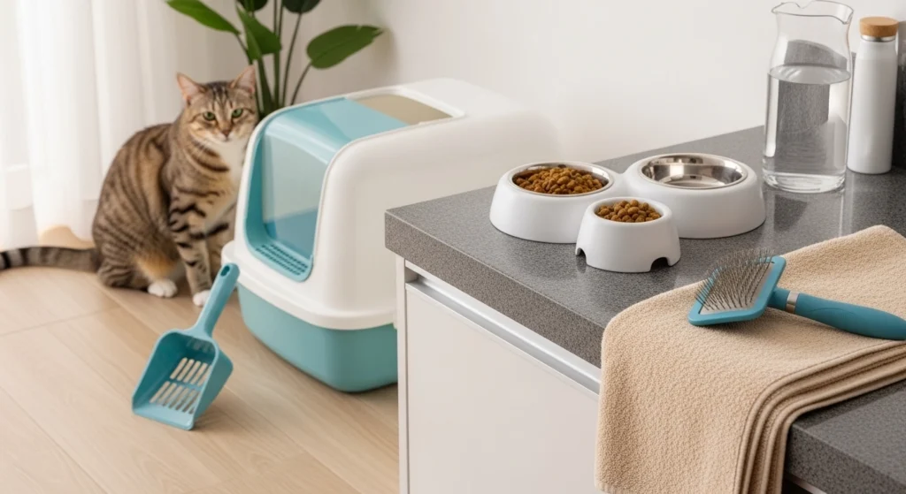 Uma rotina que funciona não depende de muitos itens, mas de itens certos. O objetivo é facilitar a manutenção diária sem estressar o gato e sem criar excesso de manipulação, algo que costuma piorar a experiência para o tutor e para o animal.
