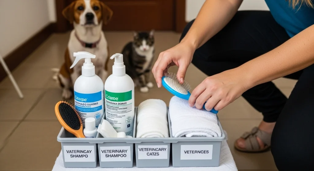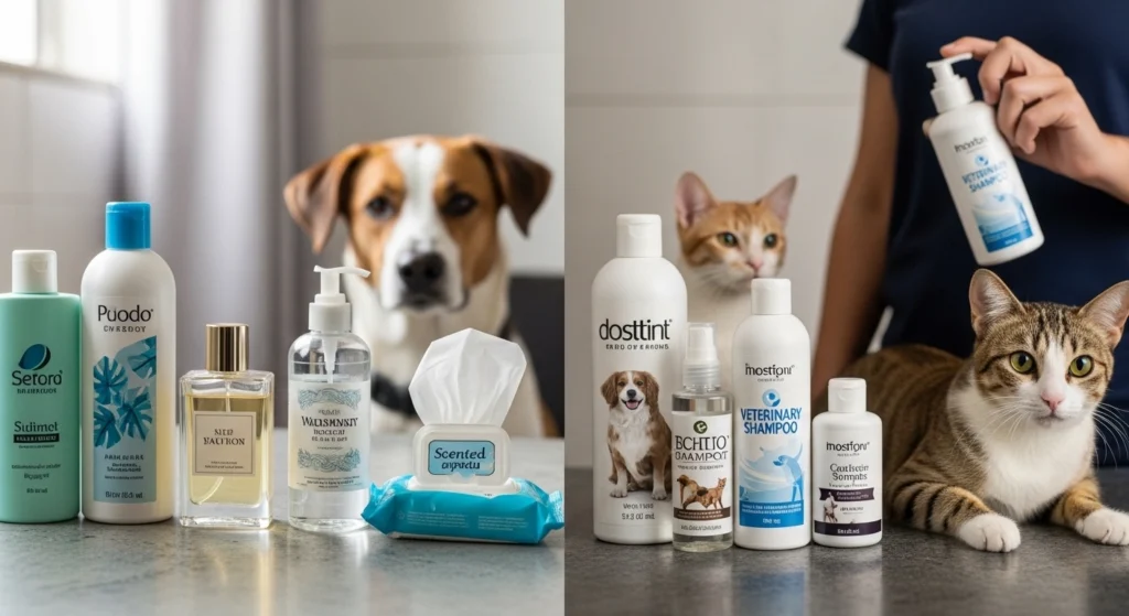 Os itens que mais merecem veto claro são os de uso humano, os de limpeza doméstica e os de uso veterinário fora da indicação correta. Isso inclui shampoo humano, sabonete corporal, sabonete antibacteriano, perfume, colônia, álcool, água oxigenada, lenço perfumado, antisséptico sem prescrição e produtos antiparasitários de outra espécie.