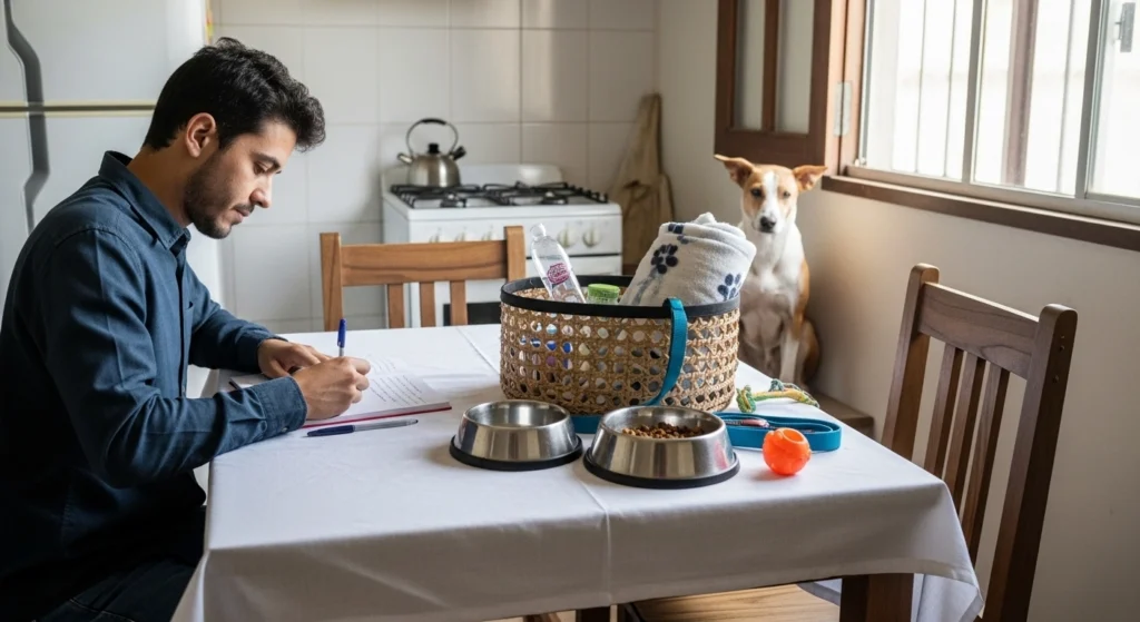 Um modelo útil é este: “Oi, para manter a rotina dele estável, peço que você use apenas os objetos que deixei separados para ele. Estão incluídos pote de água, pote de comida, medidor, manta, brinquedos, guia e itens de higiene. Evite trocar por objetos da casa ou de outro animal. Se faltar algo ou surgir dúvida, me avise antes de substituir.”