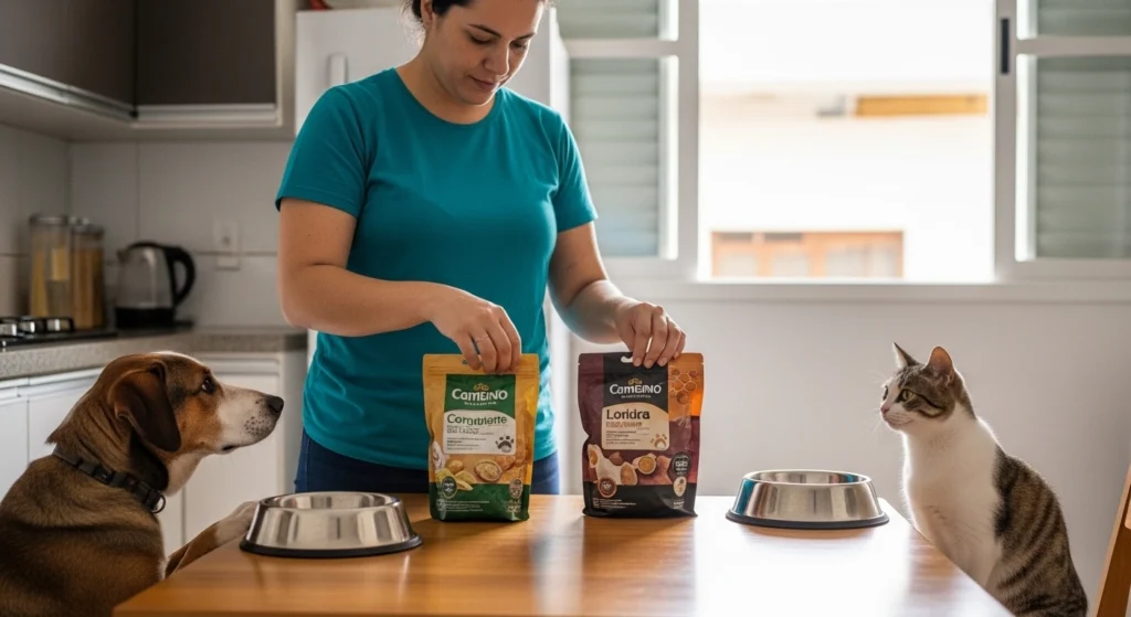 A imagem mostra um momento comum na rotina de quem tem animais de estimação: a troca de alimentação. Sobre a mesa estão duas embalagens de ração diferentes, sugerindo a mudança de dieta do pet. Um tutor organiza o alimento enquanto um cachorro e um gato observam atentos, próximos às tigelas de comida. A cena transmite um ambiente doméstico tranquilo, iluminado por luz natural, reforçando a ideia de cuidado e atenção durante a adaptação alimentar do animal.
