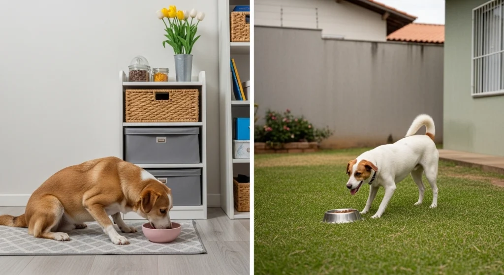 A imagem apresenta dois contextos diferentes que podem influenciar a adaptação alimentar de um animal de estimação. Em um lado, o pet aparece em um ambiente interno mais calmo, típico de apartamento, onde a rotina tende a ser previsível. No outro, o animal está em um quintal após atividade física, representando um estilo de vida mais ativo. A composição ilustra como fatores como ambiente, nível de atividade e rotina diária podem interferir na forma como o organismo do pet reage a mudanças na alimentação.